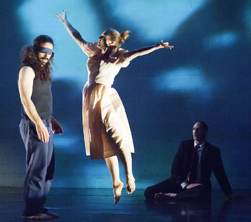 Human Landscape Dance’s “Aurora’s Dream” follows Aurora’s quest in her subconscious. In this dream/nightmare, she battles her personal demons in the shape of Prince Desire. They wrestle for dominance. Prince Desire, played by Alexander Short, knocks down Aurora, Mary Szegda, then falls on top of her. She pushes him off, and he curls her onto his lap. She pulls away, yanking him upward, as he digs in his heels, lowering her downward.